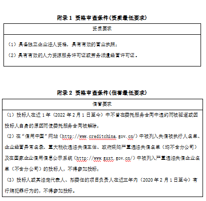 3.1.2信譽(yù)要求:(1)投標(biāo)人在近1年(2022年2月1日至今)中不曾在委托服務(wù)合同中違約而被驅(qū)逐或因投標(biāo)人自身的原因而使委托服務(wù)合同被解除;(2)在“信用中國(guó)”網(wǎng)站(http://www.creditchina.gov.cn/)中被列入失信被執(zhí)行人名單、企業(yè)經(jīng)營(yíng)異常名錄、重大稅收違法失信主體、政府采購(gòu)嚴(yán)重違法失信名單(均不含分公司)及在國(guó)家企業(yè)信用信息公示系統(tǒng)(http://www.gsxt.gov.cn/)中被列入嚴(yán)重違法失信企業(yè)名單(不含分公司)的投標(biāo)人,不得參加投標(biāo);(3)投標(biāo)人或其法定代表人、擬委任的項(xiàng)目負(fù)責(zé)人在近三年內(nèi)(2020年2月1日至今)有行賄犯罪行為的,不得參加投標(biāo);